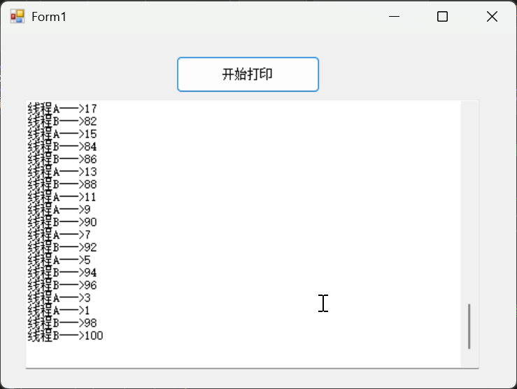 1using System; 2using System.Threading; 3using System.Windows.Forms; 4 5namespace _01_奇偶数交替打印 6{ 7 public partial class Form1 : Form 8 { 9 public Form1() 10 { 11 InitializeComponent(); 12 } 13 14 private void Form1_Load(object sender, EventArgs e) 15 { 16 // 窗体加载时,关闭跨线程非法调用检查机制 17 Control.CheckForIllegalCrossThreadCalls = false; 18 } 19 20 private void button1_Click(object sender, EventArgs e) 21 { 22 // 创建两个线程 23 Thread threadA = new Thread(PrintOdd);// 打印奇数 24 threadA.Name = "线程A"; 25 threadA.Start(99); 26 Thread threadB = new Thread(PrintEven);// 打印偶数 27 threadB.Name = "线程B"; 28 threadB.Start(100); 29 } 30 31 private void PrintOdd(object num)// 给线程当中的参数传递值,线程所绑定的方法参数类型只能是object类型 32 { 33 for (int i = (int)num; i >= 1; i-=2) 34 { 35 textBox1.AppendText(Thread.CurrentThread.Name +"--->"+ i.ToString() + "\r\n"); 36 Thread.Sleep(500); 37 } 38 } 39 40 private void PrintEven(object num) 41 { 42 for (int i = 0; i <= (int)num; i+=2) 43 { 44 textBox1.AppendText(Thread.CurrentThread.Name + "--->" + i.ToString() + "\r\n"); 45 Thread.Sleep(500); 46 } 47 } 48 } 49} 50