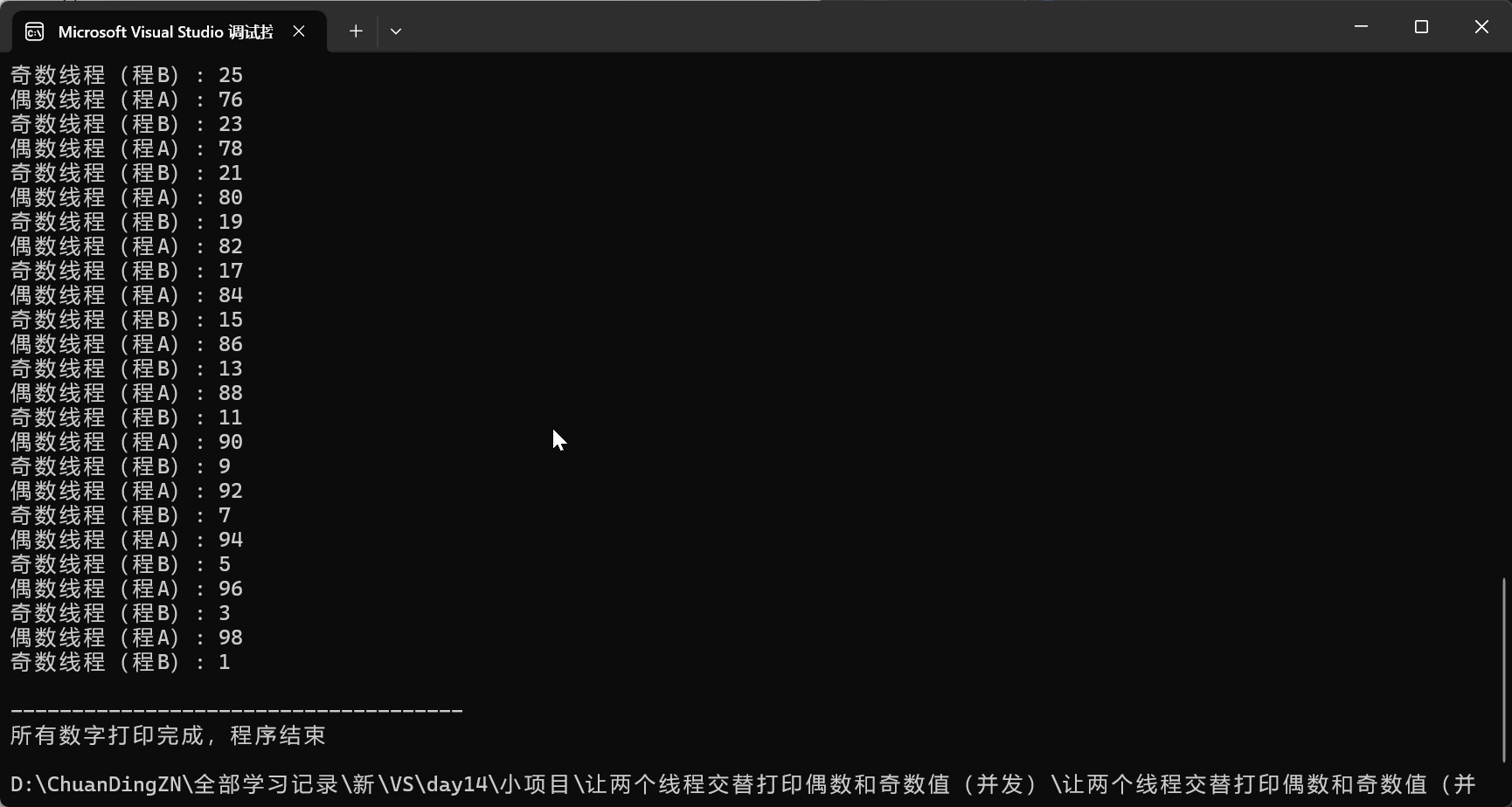 1using System; 2using System.Threading; 3 4namespace 让两个线程交替打印偶数和奇数值_并发_ 5{ 6 internal class Program 7 { 8 // ===================== 共享资源与同步工具 ===================== 9 // 1. 偶数线程的当前值(初始为0,每次+2,打印偶数) 10 private static int _evenNum = 0; 11 // 2. 奇数线程的当前值(初始为99,每次-2,打印奇数) 12 private static int _oddNum = 99; 13 // 3. 同步事件:控制偶数线程的执行权限 14 // 初始为“有信号”(true)→ 让偶数线程先执行(对应案例中先打印0) 15 private static AutoResetEvent _evenEvent = new AutoResetEvent(initialState: true); 16 // 4. 同步事件:控制奇数线程的执行权限 17 // 初始为“无信号”(false)→ 奇数线程等待偶数线程完成后再执行 18 private static AutoResetEvent _oddEvent = new AutoResetEvent(initialState: false); 19 20 static void Main(string[] args) 21 { 22 Console.WriteLine("线程交替打印开始:"); 23 Console.WriteLine("-------------------------------------\n"); 24 25 // ===================== 偶数线程(打印偶数) ===================== 26 // 创建线程:负责打印偶数(0、2、4...) 27 Thread evenThread = new Thread(PrintEvenNumbers) 28 { 29 Name = "偶数线程(程A)" // 设置线程名称,便于调试/标识 30 }; 31 32 // ===================== 奇数线程(打印奇数) ===================== 33 // 创建线程:负责打印奇数(99、97、95...) 34 Thread oddThread = new Thread(PrintOddNumbers) 35 { 36 Name = "奇数线程(程B)" // 设置线程名称 37 }; 38 39 // 启动两个线程(此时线程进入就绪状态,等待CPU调度) 40 evenThread.Start(); 41 oddThread.Start(); 42 43 // 主线程等待子线程执行完毕(避免主线程提前退出) 44 evenThread.Join(); 45 oddThread.Join(); 46 47 Console.WriteLine("\n-------------------------------------"); 48 Console.WriteLine("所有数字打印完成,程序结束"); 49 } 50 51 52 /// <summary> 53 /// 偶数线程的执行逻辑:打印偶数,完成后通知奇数线程 54 /// </summary> 55 private static void PrintEvenNumbers() 56 { 57 // 循环条件:偶数不超过99(与奇数范围保持一致) 58 while (_evenNum <= 99) 59 { 60 // 等待“偶数线程的执行信号”: 61 // - 初始为“有信号”,线程直接执行; 62 // - 执行后信号会自动重置为“无信号”,需等待奇数线程通知才能再次执行 63 _evenEvent.WaitOne(); 64 65 // 打印当前偶数(格式与案例一致:线程名 + 数值) 66 Console.WriteLine($"{Thread.CurrentThread.Name}: {_evenNum}"); 67 68 // 偶数线程的数值自增2(获取下一个偶数) 69 _evenNum += 2; 70 71 // 通知奇数线程:可以执行打印操作了 72 // 将“奇数线程的执行信号”设为“有信号”,唤醒等待中的奇数线程 73 _oddEvent.Set(); 74 Thread.Sleep(500); 75 } 76 } 77 78 /// <summary> 79 /// 奇数线程的执行逻辑:打印奇数,完成后通知偶数线程 80 /// </summary> 81 private static void PrintOddNumbers() 82 { 83 // 循环条件:奇数不小于0(与偶数范围保持一致) 84 while (_oddNum >= 0) 85 { 86 // 等待“奇数线程的执行信号”: 87 // - 初始为“无信号”,线程会阻塞; 88 // - 需等待偶数线程执行完毕后,通过_oddEvent.Set()唤醒 89 _oddEvent.WaitOne(); 90 91 // 打印当前奇数(格式与案例一致:线程名 + 数值) 92 Console.WriteLine($"{Thread.CurrentThread.Name}: {_oddNum}"); 93 94 // 奇数线程的数值自减2(获取下一个奇数) 95 _oddNum -= 2; 96 97 // 通知偶数线程:可以执行打印操作了 98 // 将“偶数线程的执行信号”设为“有信号”,唤醒等待中的偶数线程 99 _evenEvent.Set(); 100 Thread.Sleep(500); 101 } 102 } 103 } 104} 105